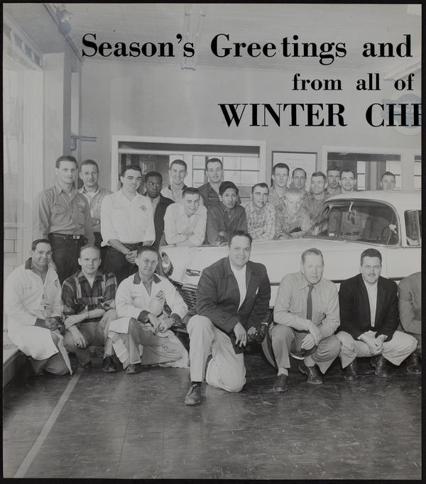 Lawrence Shops - Winter Chevrolet workforce - "Blondie" Mathews (At side of left front wheel); unknown on left; Shipman Winters; unknown; "Brownie" Kerns; M.S. "Ship" Winter.