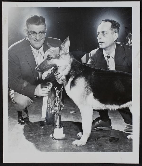 Jayhawk Kennel Club - best of show - German Shepherd- George C. Spradling (left) Judge; R. M. Brackett, owner.