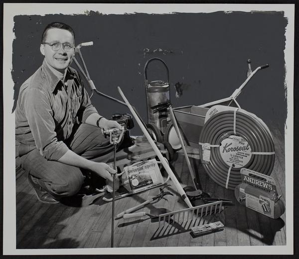 Lawrence Cleanup - yard improvement - Bob Lewis of Barteldes Seed co. shows tools.
