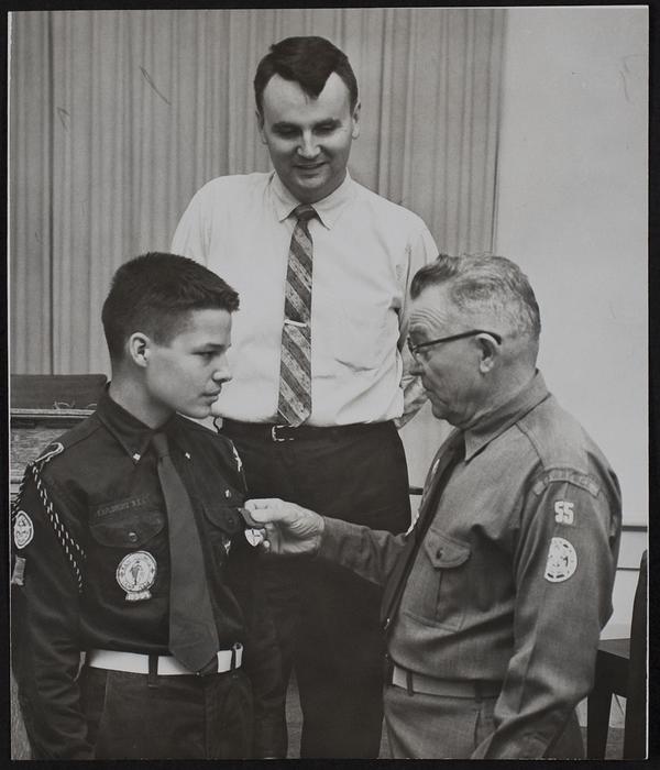 God and Country Award. Edward Alexander Jr. Troop 55, receives award from his father, Edward Alexander, sr. of 835 Me St. Ceremony was held at Westfield Presbyterian Church. Rev. Wm. Radcliff looks on.