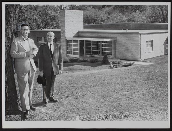 Two Men in front of [Oldfather] building.