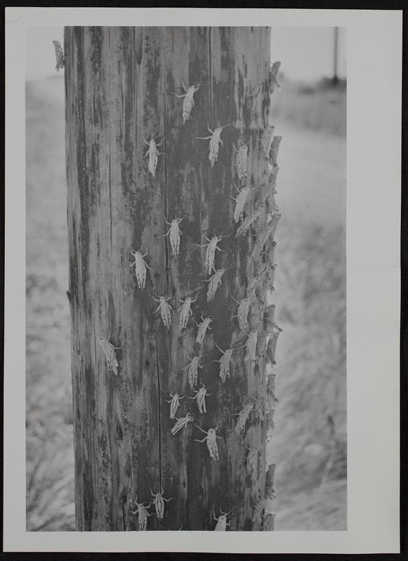 Grasshoppers on "shady" side of utility pole.