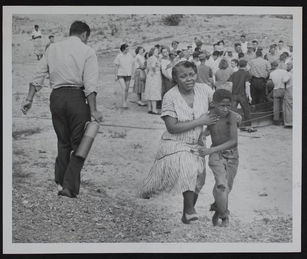 12 year old Wray Jones drowns. (L to R) F. C. Sanders, asst. Fire Chief; Mabel Powell, Grandmother; Amos Jones, Brother.