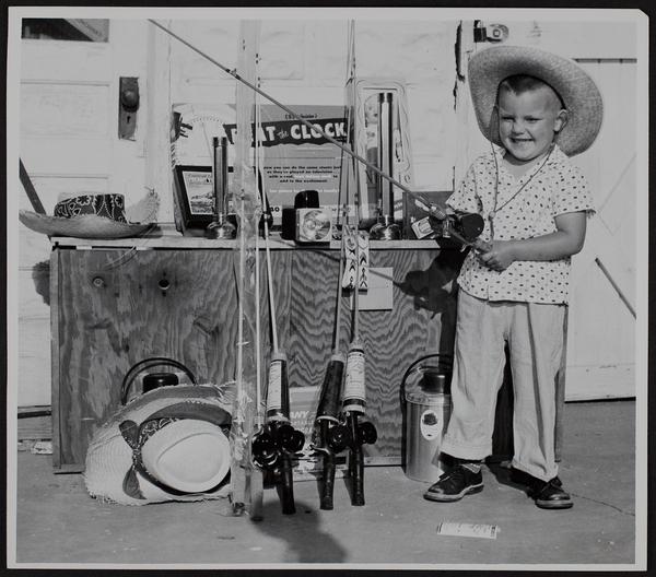 After bigger stakes this year, Chris Hunsinger, 3 year old son of Mr. and Mrs. Don Hunsinger, 908 Rockledge Road, looks at prizes he might win during the Douglas County Derby at the Club Lake near Clinton.