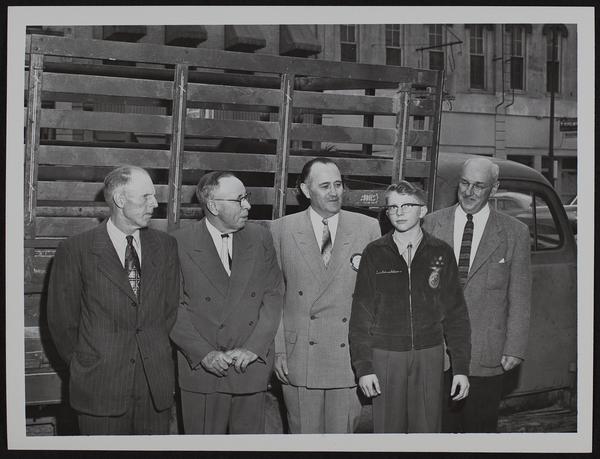 Business Clubs - Rotary - Prize award to 4-H Contestant - angus heifer (L to R) George Donaldson (father of winner); Elmer Ousdahl; R. R. Zurbuchen; Ervin Donaldson (winner); Roger Allen, sr.