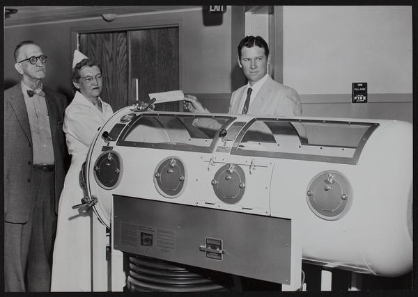 Polio - Iron lung purchased by LM Hospital (L to R) Dr. Fed R. Isaacs; Mrs. Mary Dunden H. K. Traul, Chairman of IOOF fund drive.