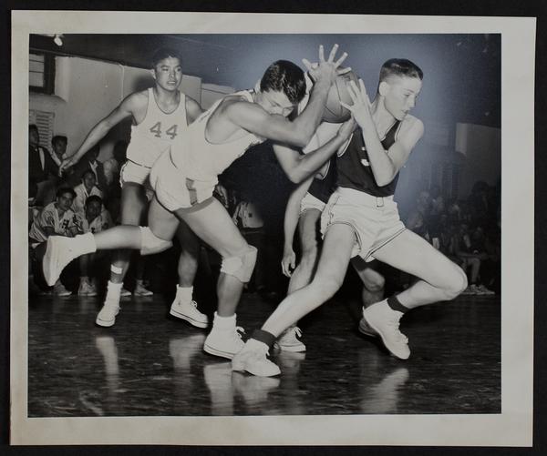 Haskell Basketball v. Osage City. Tom Sugar (left) of Haskell and Bolin of OC.