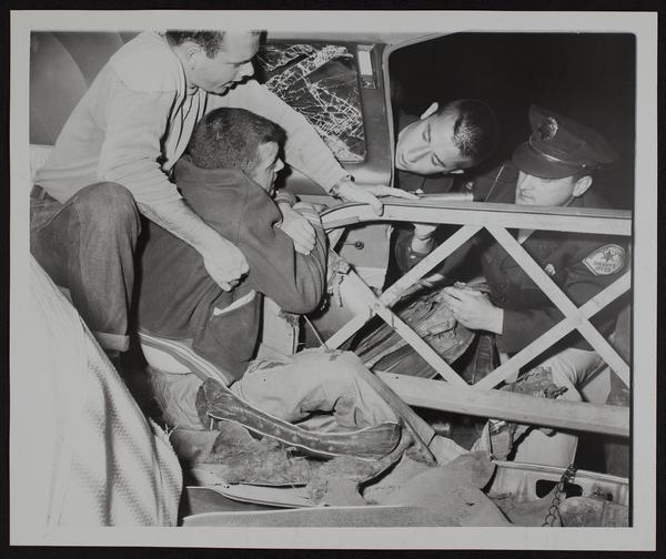 Auto Wreck - KU students Justin Cash (left) and Beldon Mills. Officers Bill Mooniau (left) and Rex Johnson.