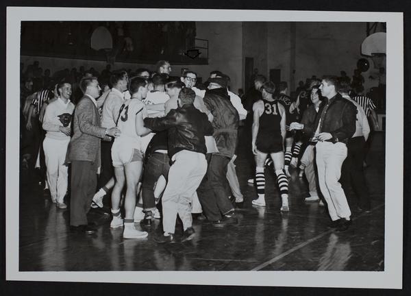 Baker Basketball - vs. Ottawa U. Fans on court after win for Baker - Jim Kean (arrow) won free throw.