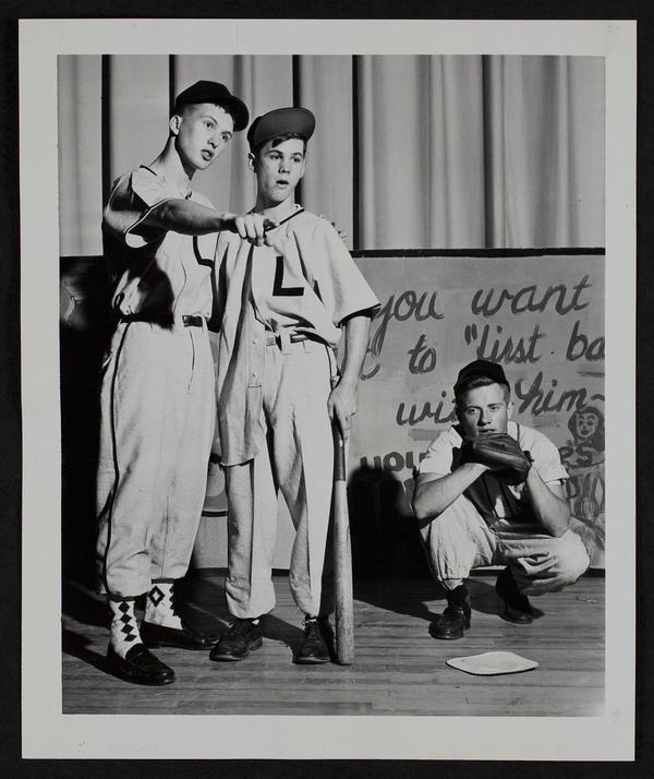LHS Red and Black Revue - "Lomie at the Bat" skit - (L to R) George Greer; Bob Lohman (Lomie); and Chuck Broadwell.
