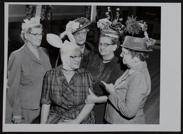 Clubs - Past Noble Grands "funny hat day" (L to R) Ollie Bruchmiller; May Rowley; Nannie L. Ireland; Mae Noever; Edith Benson in center.