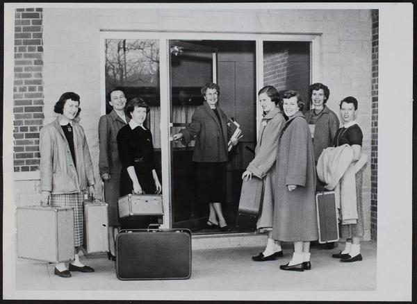 Baker Sororities - PHI MU - move to new house. (L to R) Cynthia Spear; Nancy Jo White; Mrs. David Johnson, housemother; Connie Williams; Dianne Clerk; Mrs. Allan Daughter; Bettalou Torneden.