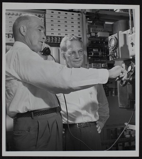 Dial phones - Lecompton - Mayor George F. Bahnmaier uses phone and Owen Smith, manager of Lawrence Office looks on.