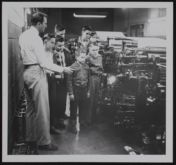 Journal World - Out of Town carriers tour. JW Building (L to R) William Metier, circulation manager; Carl Johnson, Baldwin; Eldon Brown, Desoto; Frank Huffman, Sunflower; Jimmy Ross, Perry (foreground) Wayne Ireland, Sunflower (behind) Lynn Johnson; Tonga