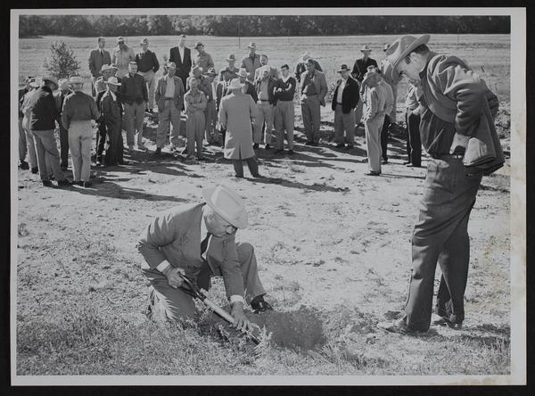 Soil conservation - Willis Colman digs up ground to show Lawrence ministers results - County Conservationist Melvin Wertzberger looks on.