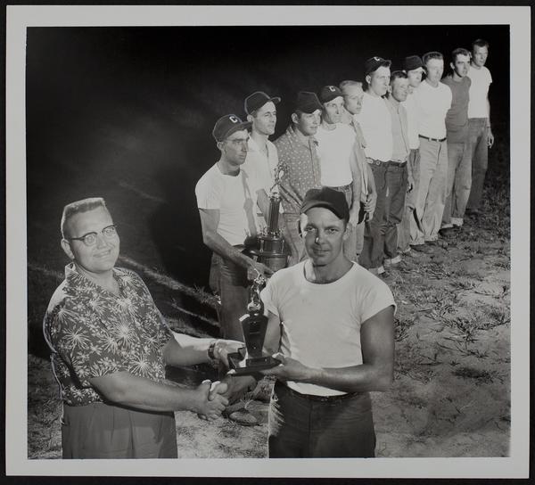 Clinton - Softball team wins sportsmanship trophy - (L to R) (Front) Darwin A. Redmond and Franklin Bidinger, mgr. (Behind) Dale Christy; Howard Lynch; Bruce Tate; Frank Bidinger; Emett Reed; Charles Hodges; Lanny Tate; Clarence Lynch; Glenn O'Conner; Way
