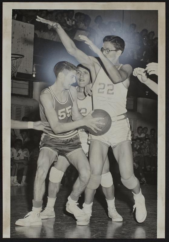 Haskell Basketball vs. Holton (L to R) Lyle Johnson (55) (Holton); Richard Powell (center); Elliott Ryall (22).