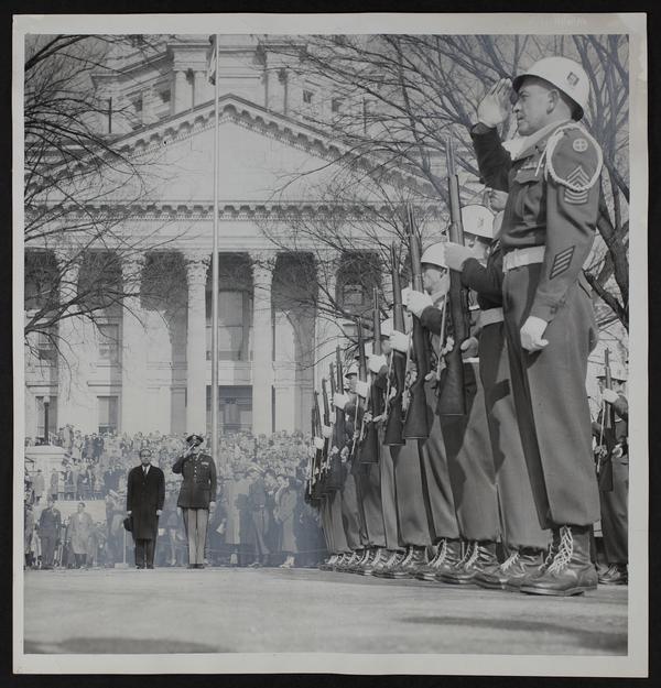 Inauguration - Fred Hall and Maj. Gen. Joe M. Nickell, State adjutant General Inspect Kansas National Guard Troops.