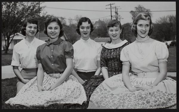 LHS cheerleaders (L to R) Virginia Cox; Sharon Ward, head Cheerleader; Judy Long; Jeannie Wheeler; Nancy Miller.