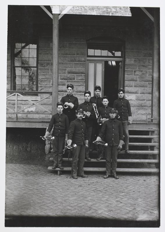 Cavalry Buglers Standing on Fort Riley Porch Holding Their Bugles
