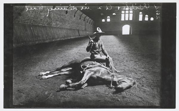 Soldier, Gibbs, A, 2 in Fort Riley Riding Hall Sitting on Side of Horse Laying on Ground