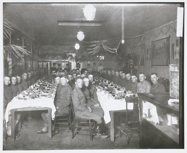 Arcade Banquet, 6th F. H., Medical Officers Training Corps, Soldiers Sitting at Banquet Tables, Fort Riley