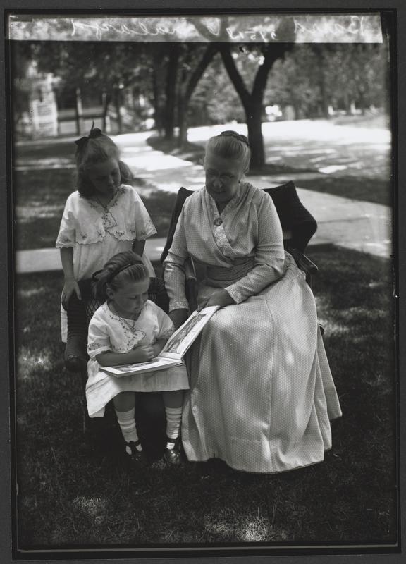 Capt. Baird Children and Grandmother Sitting on Lawn Looking at Photo Album