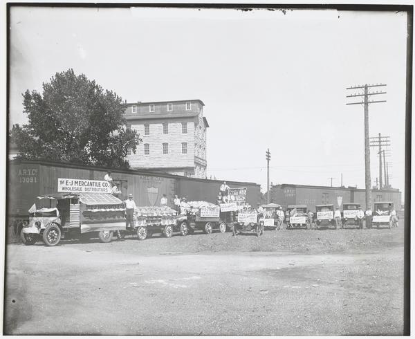 E and J Mercan.. Tile Company Trucks Displaying Produce in Front of Railroad Cars