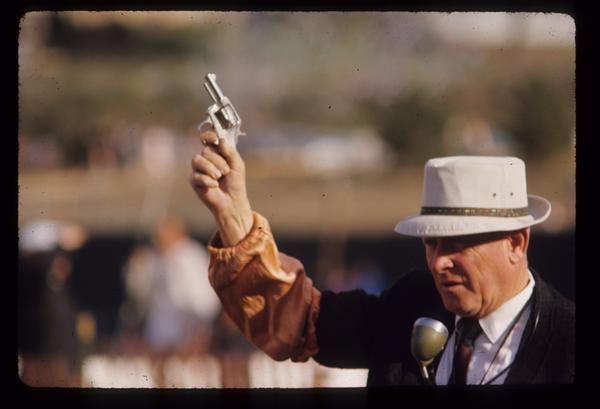 Man holding a starting pistol in the air