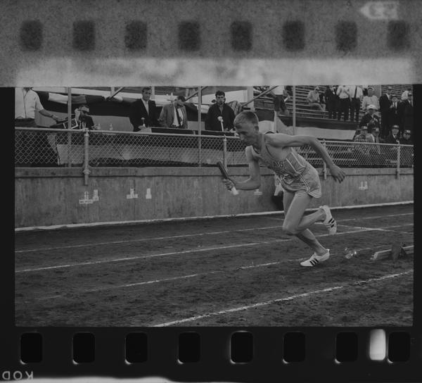 Kansas Frosh athlete leaving the starting blocks for a relay race