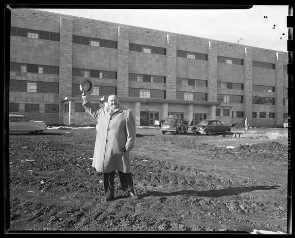 Phog Allen in front of fieldhouse