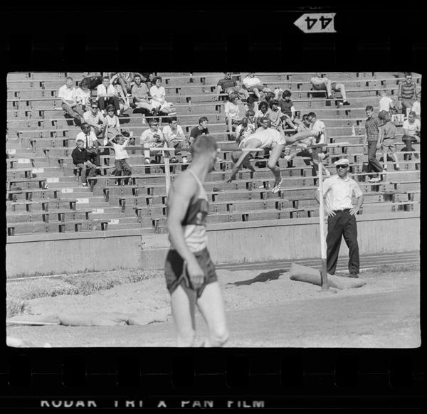 Athlete at mid-height of a high jump, another athlete standing in the foreground