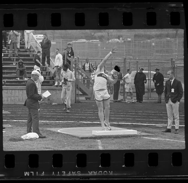 Athlete with "south" on his tank top throwing the shot put