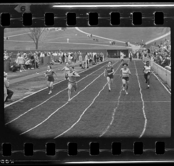 Six athletes finishing a race