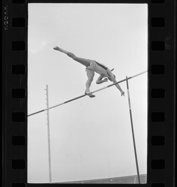 OU athlete at mid-height of a pole vault
