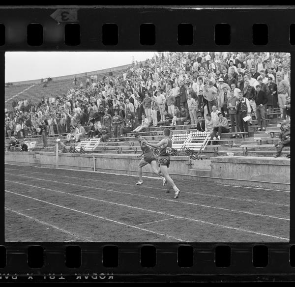 Two athletes handing off the baton during a relay race