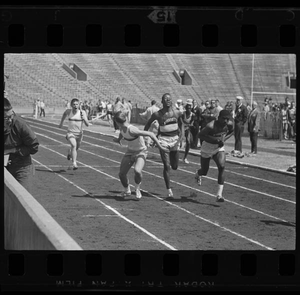 Athletes handing off the baton during a relay race