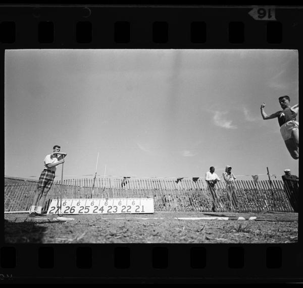Athlete with an A on his tank top in the middle of a long jump