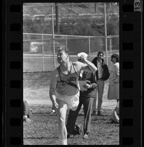 Missouri athlete in the stance of having just thrown a shot put or javelin