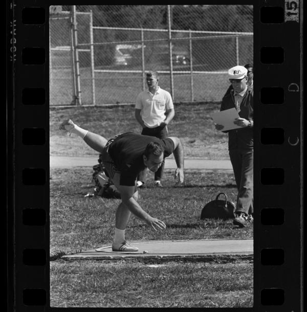 Athlete in dark-colored shorts and t-shirt having just thrown a shot put