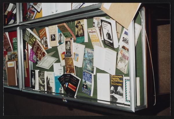 Library display case featuring theatrical works and programs