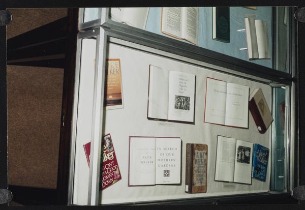 Library exhibit display case featuring books by African American authors