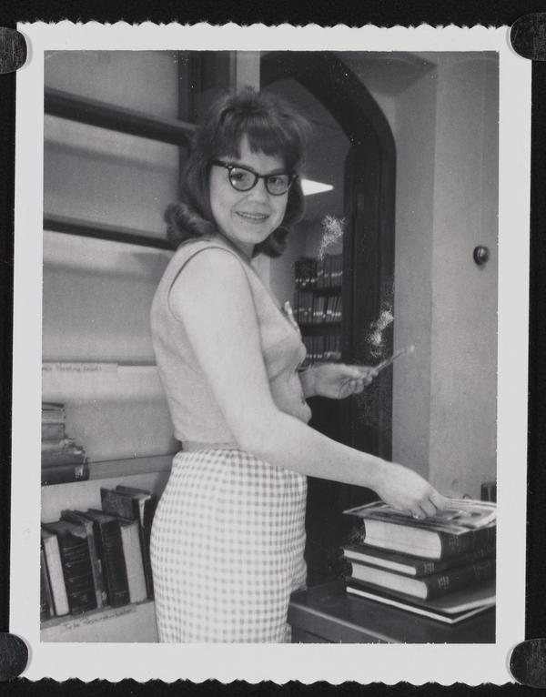 Library staff member organizing books in circulation area