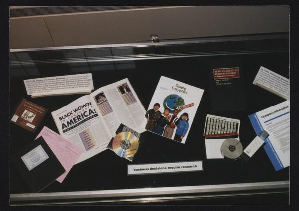 Library exhibit display case featuring African American business resources