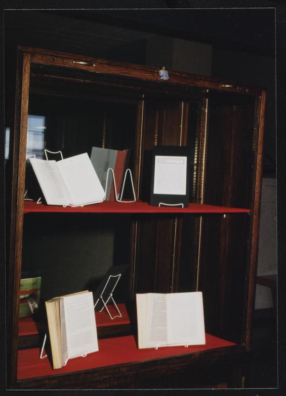 Library exhibit display case with open books and documents