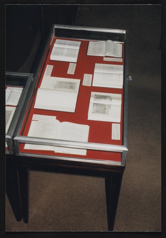 Library exhibition display case with historical documents