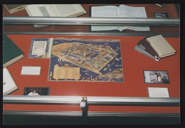 Library exhibit display case featuring historical materials and aerial illustration