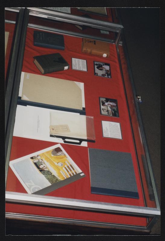 Library exhibit display case with books, photographs, and documents