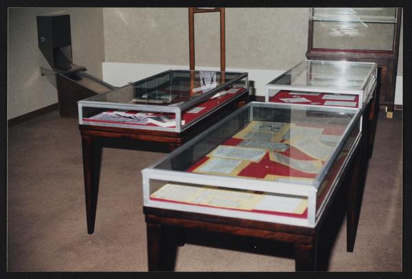 Library exhibit display cases with documents and materials