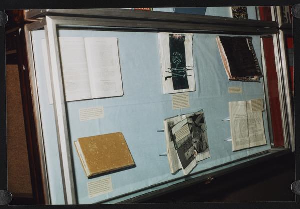 Library exhibit display case with historical documents and photographs